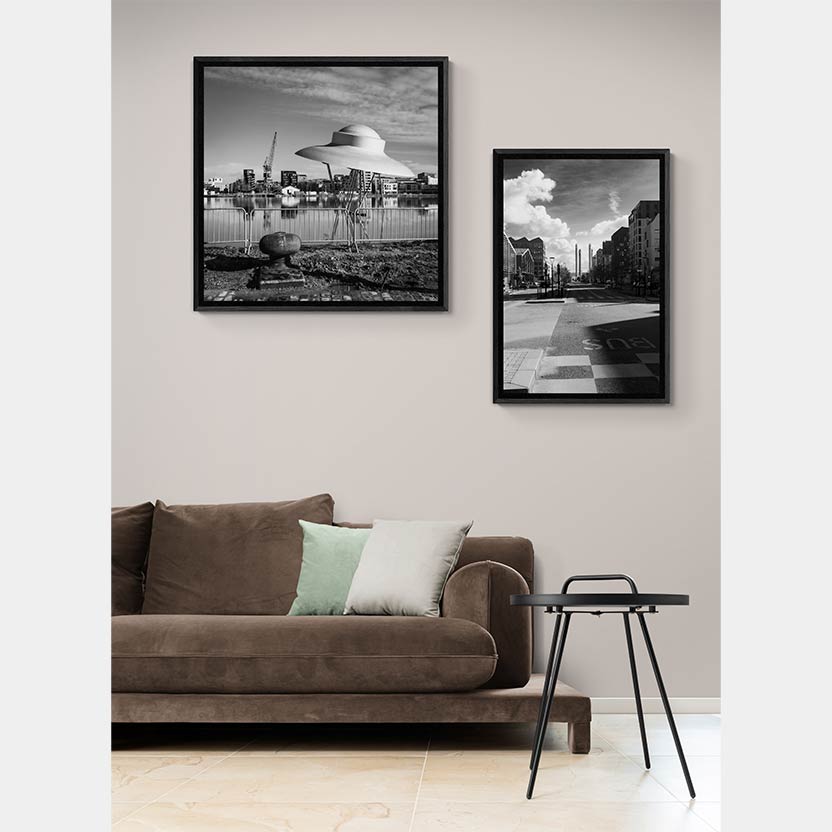 Impression sur papier d’art satiné (250 g), contrecollé sur Dibond (plaque d’aluminium 2mm) et protégé par un film anti-UV invisible. Encadrement en caisse américaine bois, couleur noir.