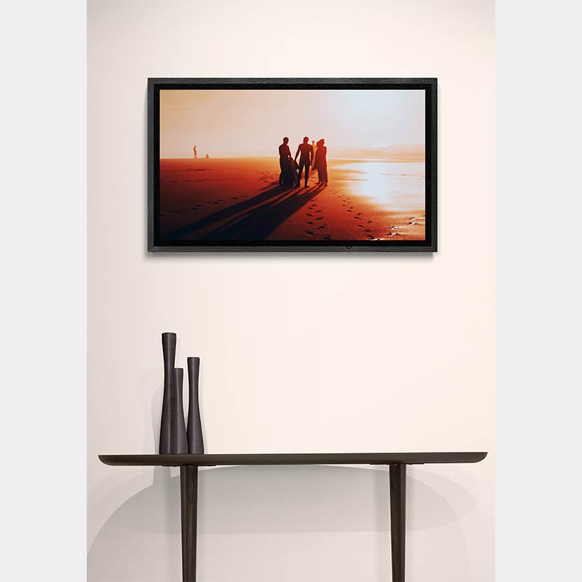 Impression sur papier d’art satiné (250 g), contrecollé sur Dibond (plaque d’aluminium 2mm) et protégé par un film anti-UV invisible. Encadrement en caisse américaine bois, couleur noir.